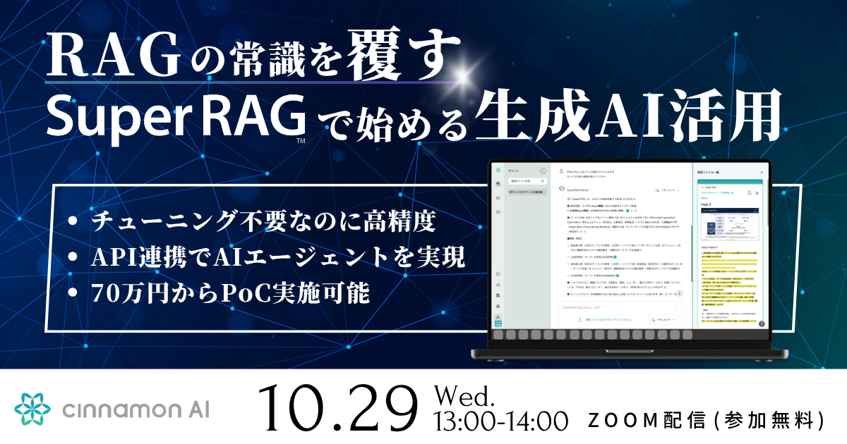 本セミナーでは、一般的なRAGとの違い、Super RAGならではの技術的優位性、実際のデモンストレーションをご紹介します。「RAGを導入したが成果につながっていない」「検討中だが正直不安がある」という企業様に特におすすめの内容です。無償トライアルのご案内もございますので、ぜひお気軽にご参加ください。